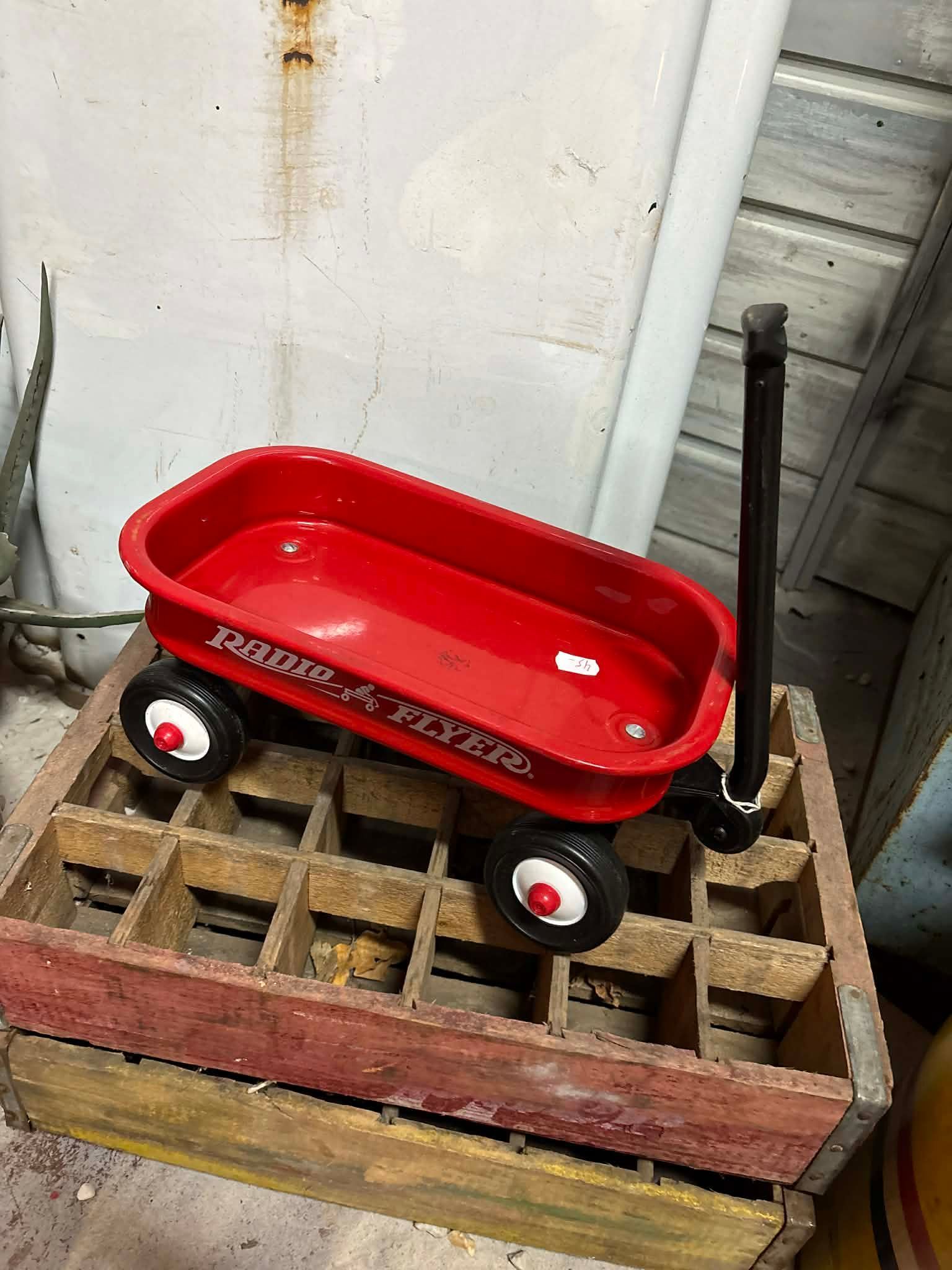 Superbe petit chariot Radio Flyer en métal rouge, reproduction miniature du célèbre wagon américain pour enfants.