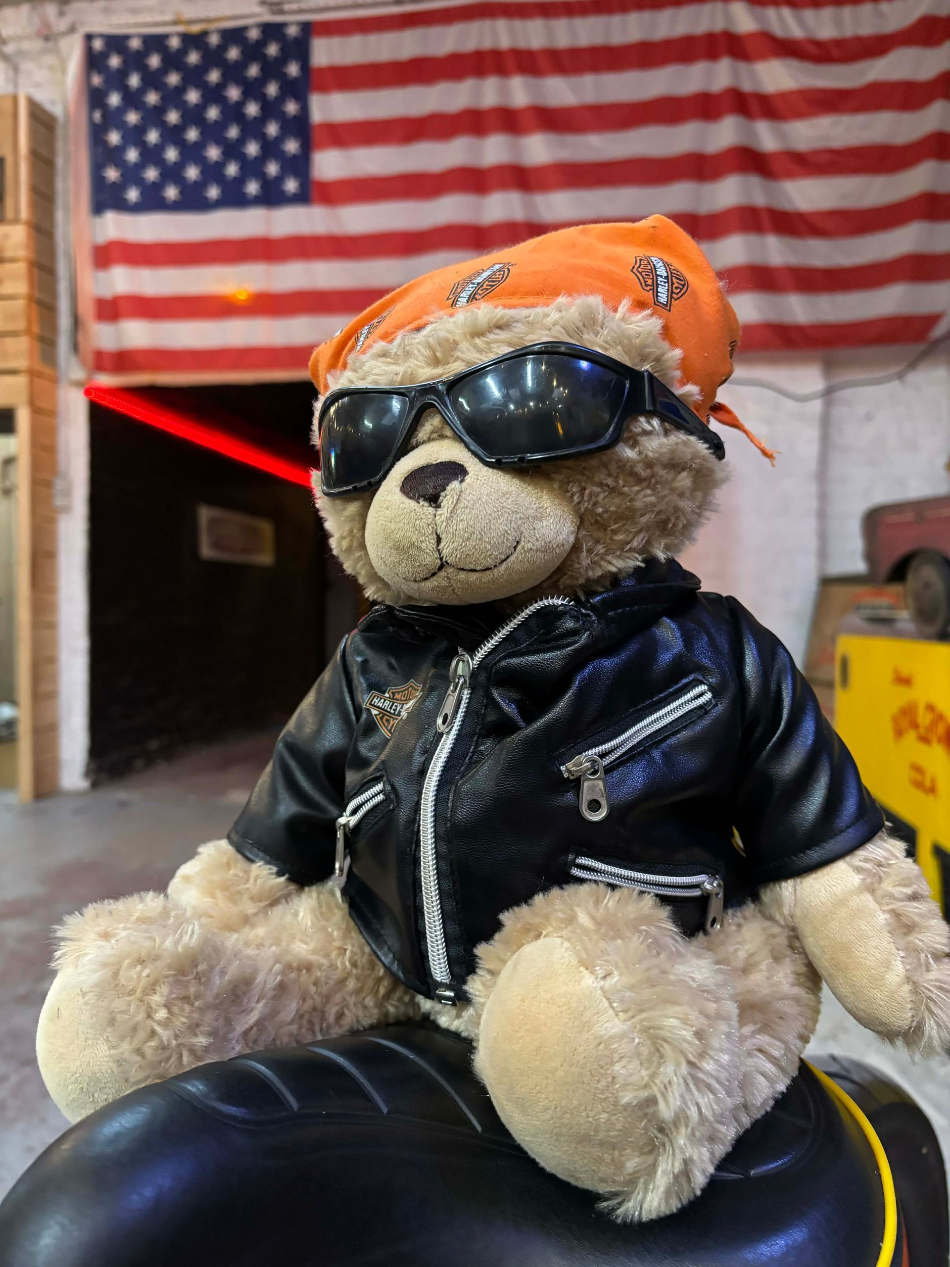 Cette peluche porte une veste noire esprit cuir, des lunettes de soleil et un bandana orange, lui donnant un look résolument rock et décalé, inspiré de l’univers biker américain.
