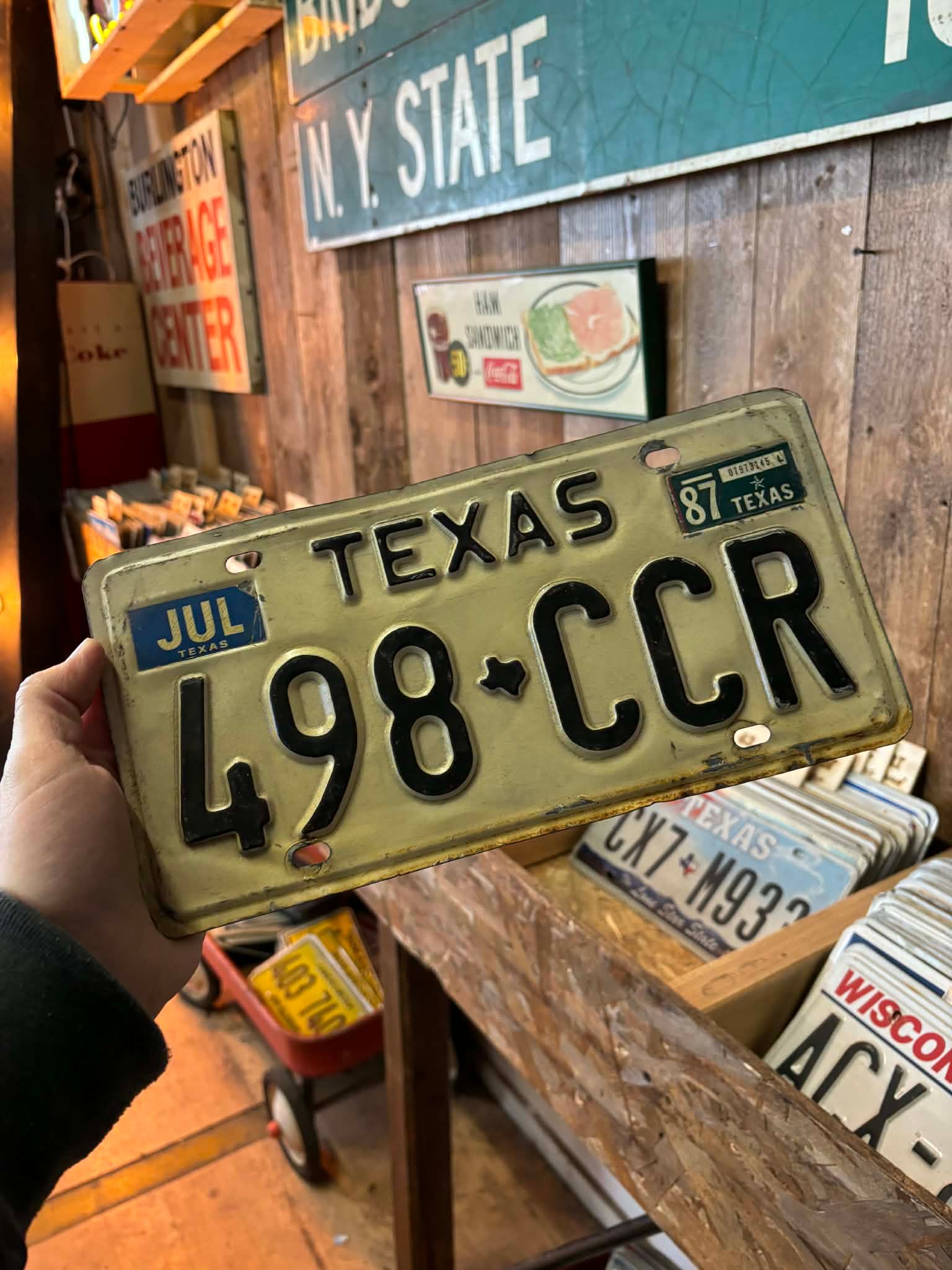 Il s’agit d’un ancien modèle avec fond beige et lettrage noir en relief, accompagné de la petite étoile texane entre les caractères. On retrouve également la vignette JUL et l’année 87, ce qui en fait une belle pièce rétro pour les amateurs de déco USA.